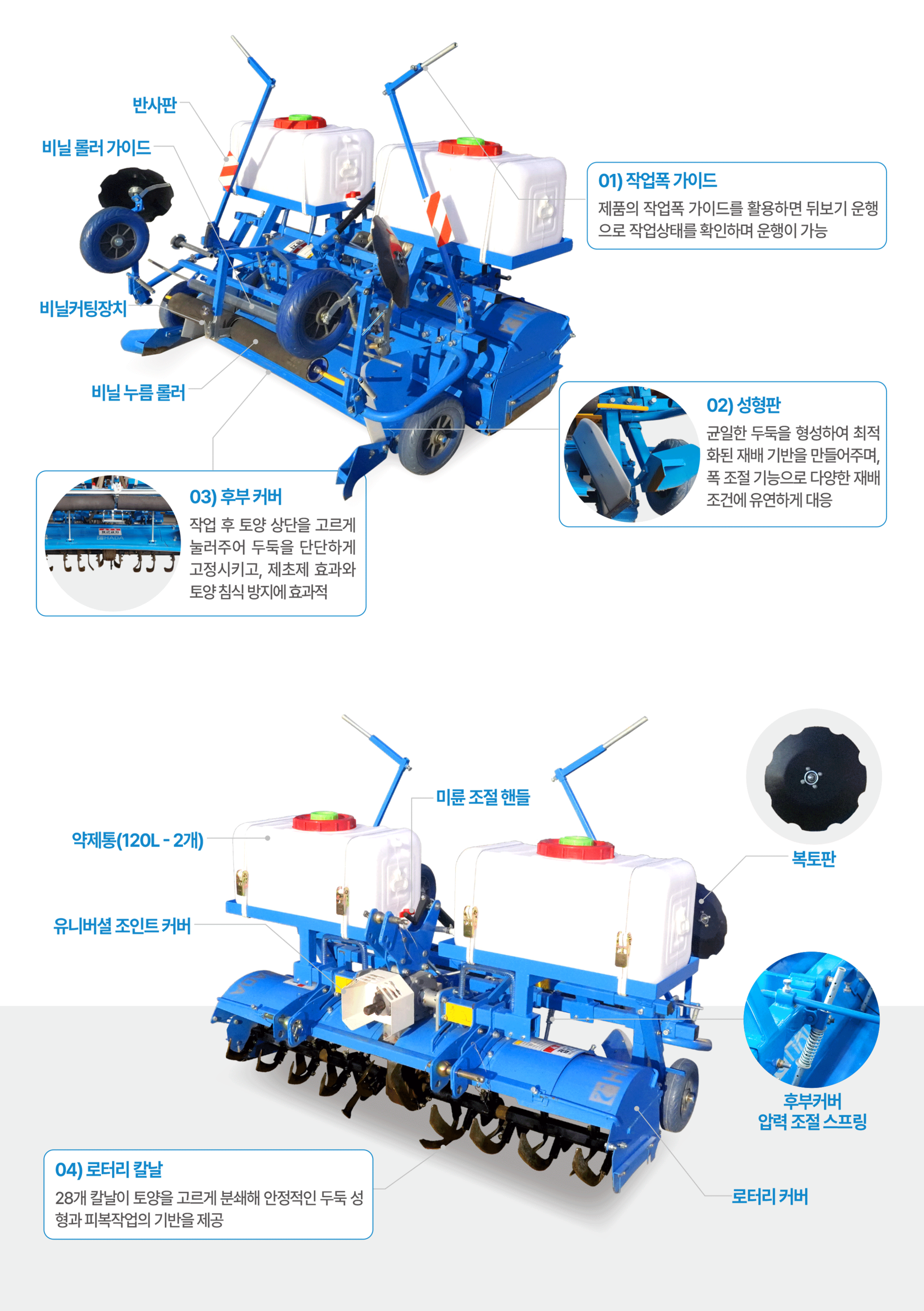 28개의 칼날이 토양을 고르게 분쇄해 정밀한 두둑 성형이 가능하고, 중앙이 높고 측면이 낮은 구조로 배수 성능을 높여 작물 피해를 최소화합니다. 또한 토양 다짐과 밀착 피복으로 잡초 억제와 토양 침식 방지에 효과적이며, 승용관리기와 소형 트랙터 등 다양한 기종과의 호환성이 뛰어나 효율적인 농작업을 지원합니다.
