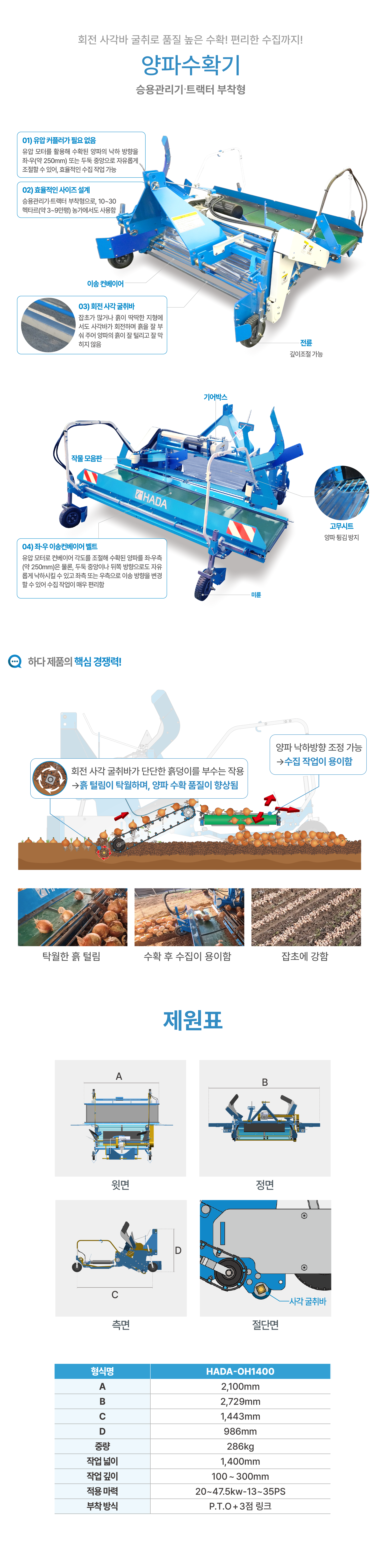 회전 사각 굴취바 타입으로 흙 털림과 수확 품질이 우수함