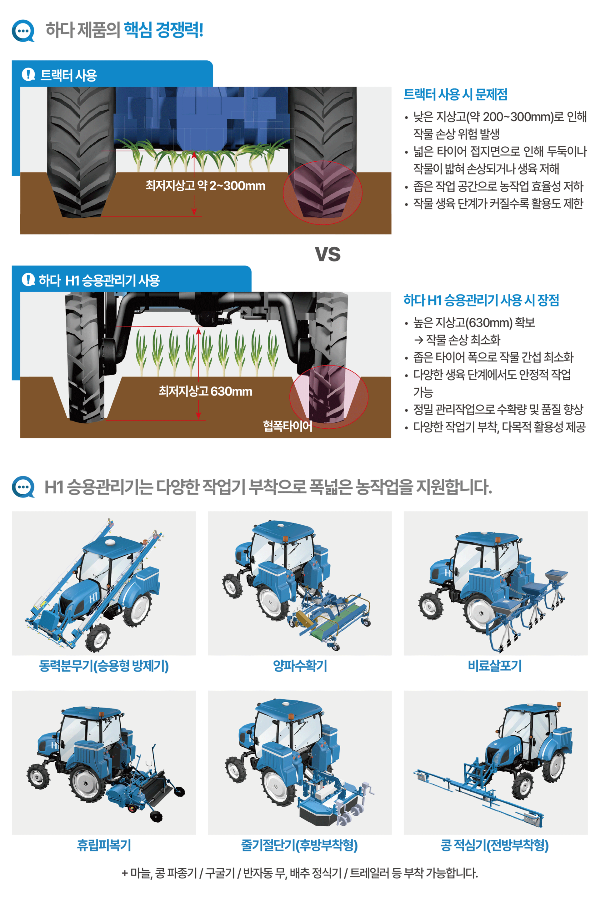 H1 승용관리기는 밭작물 전용으로 설계된 35마력 승용관리기로, 높은 지상고 630mm를 확보해 작물 손상을 최소화하며 안정적인 작업이 가능합니다. 2단 HST 트랜스미션과 크루즈 컨트롤을 탑재해 부드럽고 편리한 주행이 가능하고, 전·후방 8개의 유압 포트를 통해 다양한 작업기를 동시에 장착할 수 있습니다. 또한 600L 대용량 탱크로 연속 작업이 가능하며, 냉난방 캐빈과 인체공학적 시트가 장착되어 장시간 작업에도 쾌적한 환경을 제공합니다. 차 폭 조절 기능으로 다양한 작물 재배 환경에 대응할 수 있고, 전후방 LED 작업등과 와이퍼, 미러 시스템으로 탁월한 시야를 확보해 효율적인 작업이 가능합니다.
